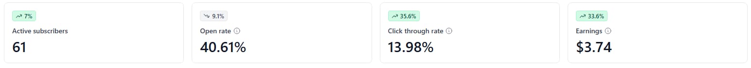 The numbers might not be massive, but at least the subscriber and earnings figures are going in the right direction. I’ve decided to wait until the end of the year to withdraw my Beehiiv ad earnings, so I’m just letting that build up in the background (currently it’s at $17.40, so not exactly life-changing).